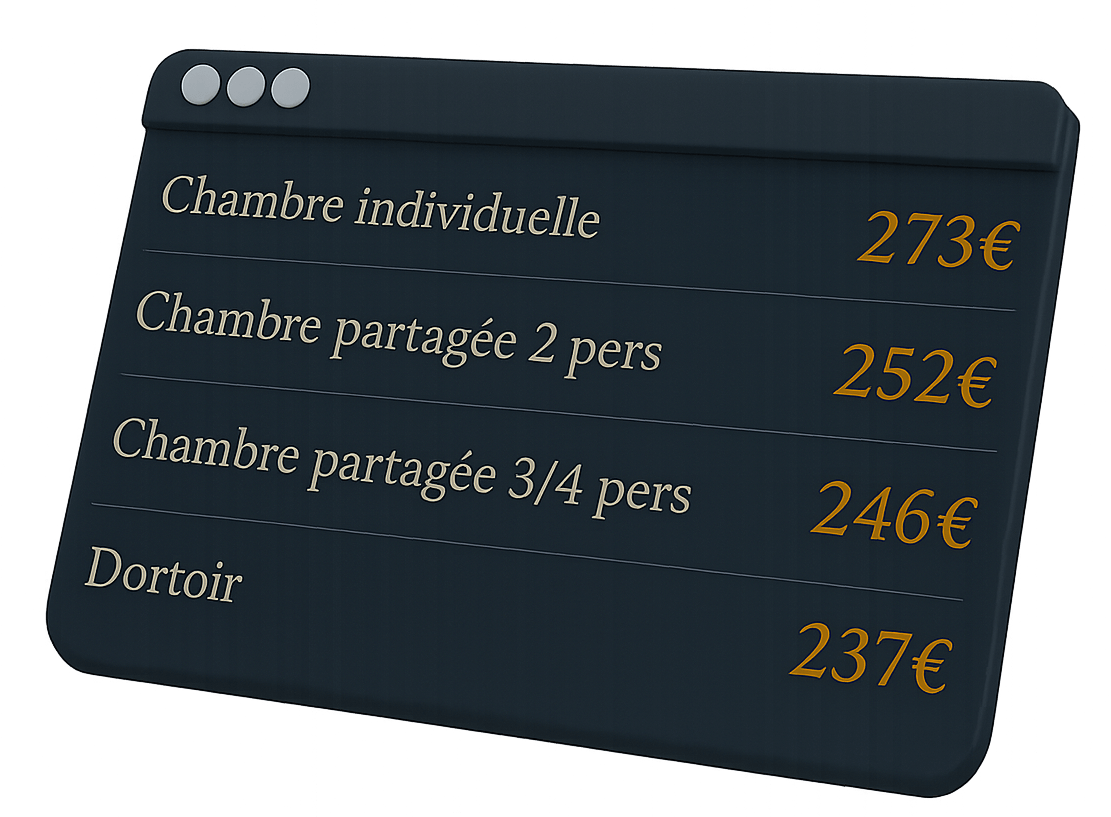 Nous proposons le jeûne intermittent pendant ce stage, ainsi la demi-pension inclut uniquement le déjeuner et le dîner, sans petit-déjeuner.